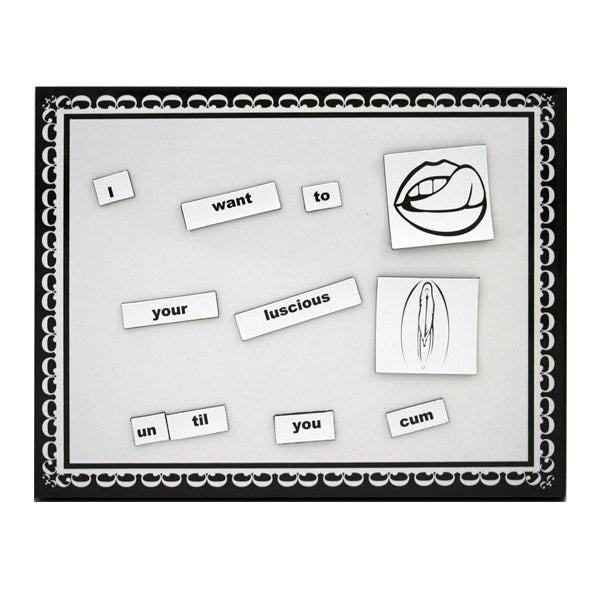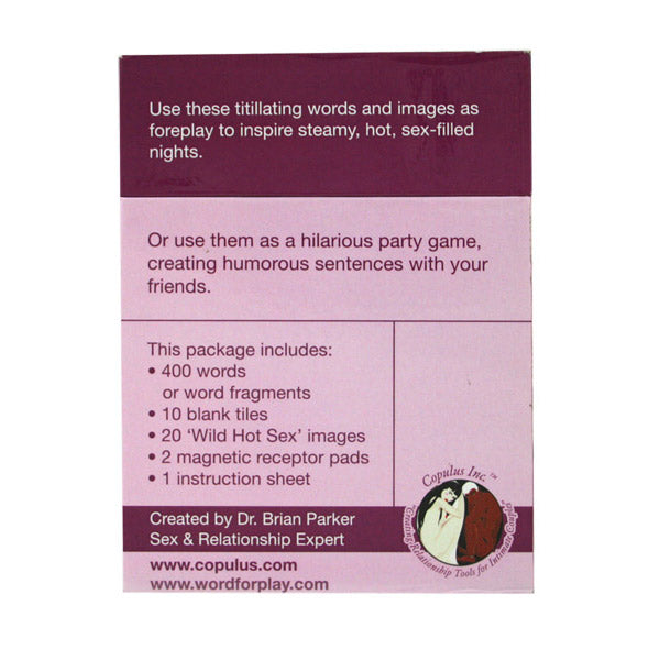 Use these titillating magnetic words and images as foreplay to inspire steamy, hot, sex-filled nights. Or use them as a hilarious party game, creating humorous sentences with your friends. A fun and sexy way for couples to leave messages for one another. "Wild Hot Sex" includes 400 sexy words and 20 hot images with limitless erotic combinations. Each set also comes with 2 magnetic receptor pads which allow couples to leave messages privately. This game includes: 400 magnetic words or word fragments. 10 blank word tiles. 20 sexual images. 2 magnetic receptor pads. 1 instruction sheet.