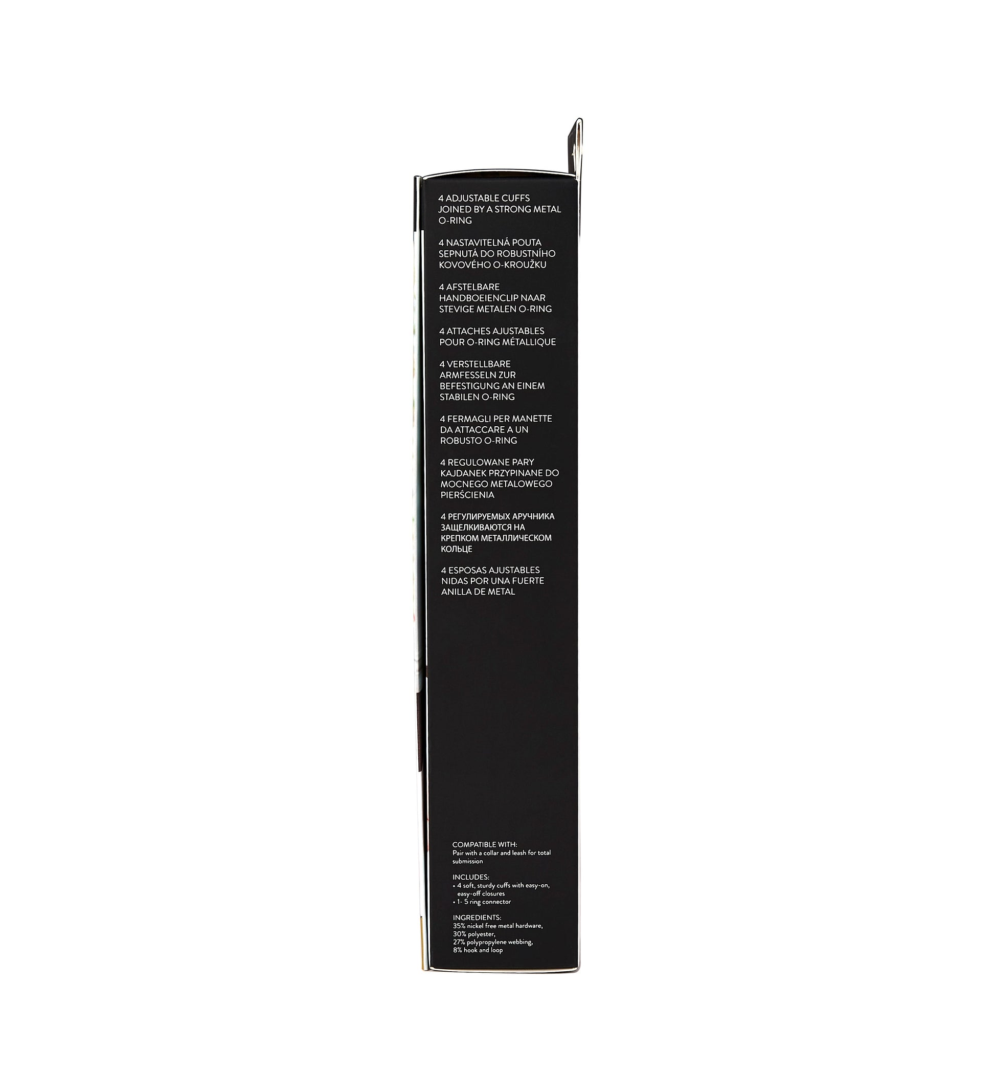 - Includes 4 cuffs and a 4-way hogtie connector