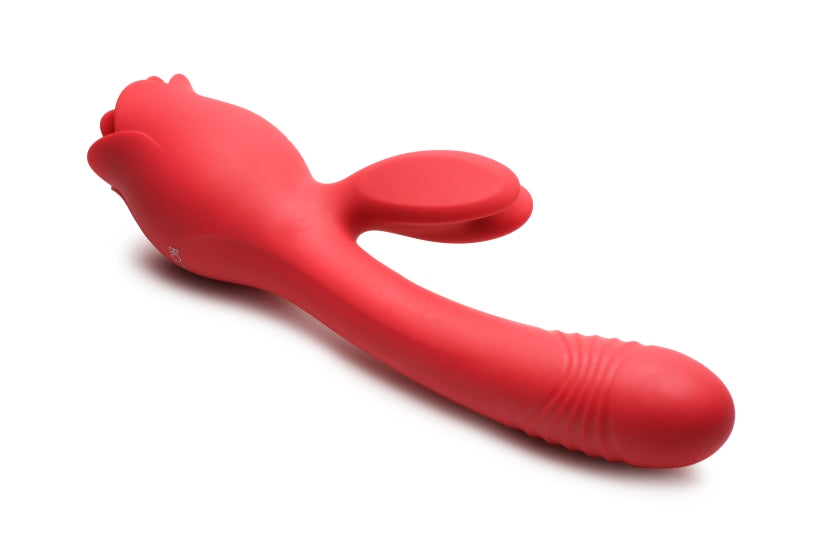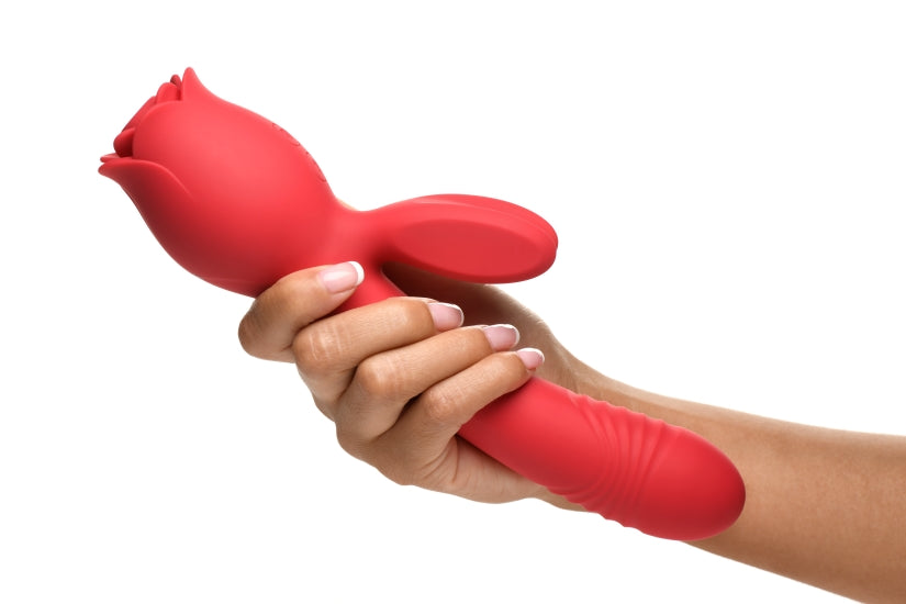 Widest insertable diameter 1.4 inches. Suction hole diameter 0.5 inch. Materials: Silicone, ABS Plastic. Color: Red. Note: please use only with water based lubricants. Key features The Full Package Rose: this rose has everything! With dual motors, it gives you a budding rose that sucks your clit, an auto thrusting, ribbed shaft, and buzzing rabbit ears to stimulate your clit while the shaft is inserted! Features can be used simultaneously or separate. Thrusting and Vibration. Enjoy the flexible, curved and slightly ribbed shaft that auto thrusts while the ears vibrate. Enjoy 3 levels of thrusting and vibration! Intense suction. Enjoy 10 delicious levels of suction! Waterproof. Rated as IPX6, it can be taken in the shower too! Recharge using the USB cable provided between uses. Premium Silicone. Enjoy quality, body safe, premium, phthalate free Silicone. Categories: Valentine's Day Item, Rabbit Style Vibrators, Eco-Friendly Sex Toys, Rechargeable Vibrators, Sex Toys for Women, G-Spot Rabbit Style Vibrators. 2024.