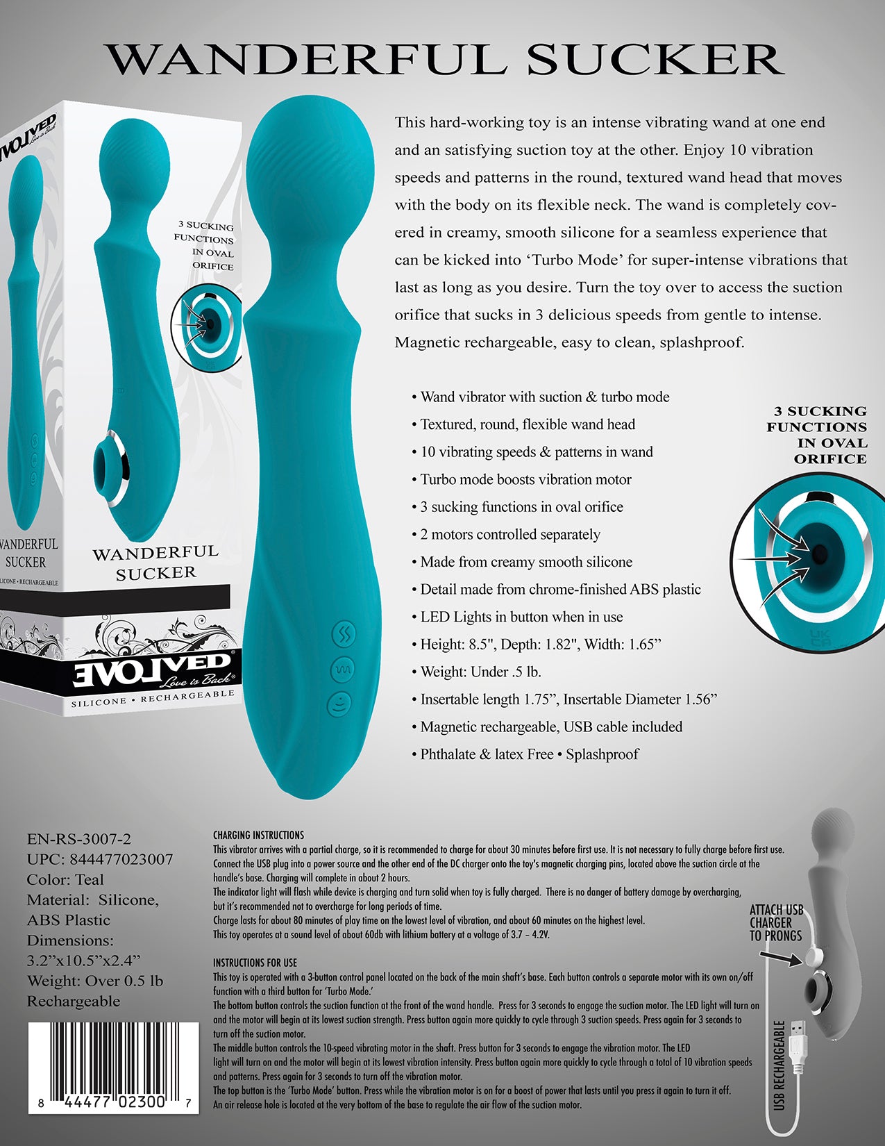Evolved Wanderful Sucker Wanderful Sucker Wand Massager. This hard working sex toy is an intense Vibrating Wand at one end and an satisfying suction toy at the other. Enjoy 10 vibration speeds and patterns in the round, textured wand head that moves with the body on its flexible neck. The wand is completely covered in creamy, smooth Silicone for a seamless experience that can be kicked into Turbo Mode for super intense vibrations that last as long as you desire. Turn the toy over to access the suction orifice that sucks in 3 delicious speeds from gentle to intense. Magnetic rechargeable. Easy to clean, splashproof. Features: Wand vibrator with suction and turbo mode. Textured, round, flexible wand head. 10 vibrating speeds and patterns in wand. Turbo mode boosts vibration motor. 3 sucking functions in oval orifice. 2 motors controlled separately. Made from creamy smooth Silicone. Detail made from chrome finished ABS Plastic. LED Lights in button when in use. Height 8.5 inches. Depth 1.82 inches. Width 1.65 inches. Bulk weight under half a pound. Insertable length 1.75 inches. Insertable diameter 1.56 inches. Magnetic rechargeable, USB cable included. Phthalate free and latex free. Splashproof. Categories: Vibrators, Clitoral Stimulators, Rechargeable Vibrators, Magic Wands, Body Massagers, Double Ended Body Massagers, Health and Beauty Aids. 2023.